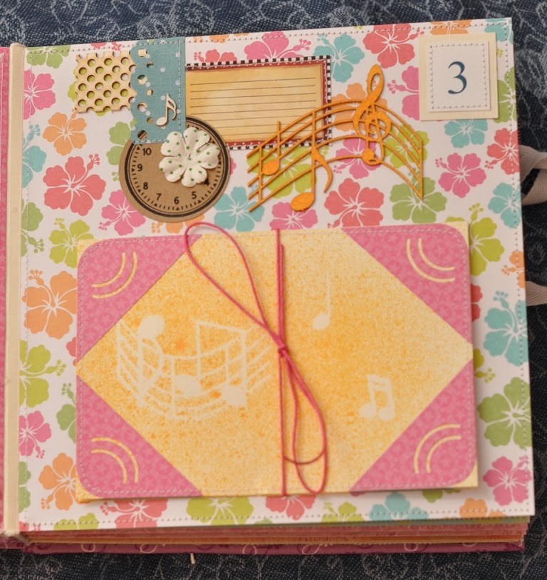 Чипборд "Ноты" сначала был большой, но я его разломила на 2 части и распределила на 2 страницы. Чипборд положила на подложку и тонировала спреем, таким образом и чипборд покрасила, и подложка красивая получилась.