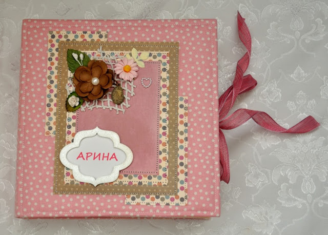 Альбом формата 20х20 см, 7 разворотов, вмещает 55 фотографий разного формата, карман для бирочек из роддома и карман для не вместившихся фотографий. Бумага K&Company из разных коллекций. Обложка тканевая (хлопок), альбом завязывается на ленту.